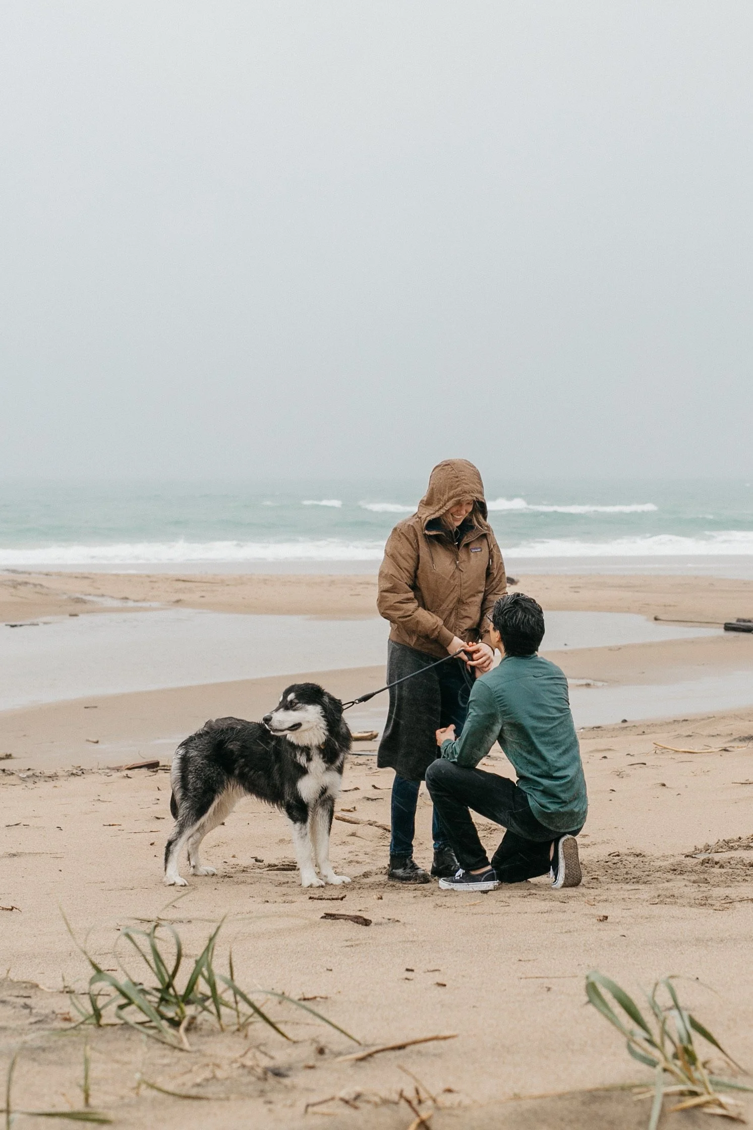 Buckley was in the car with us as we headed towards Santa Cruz in the pouring rain and Vincent silently stressed about his surprise beach proposal. Vincent pulled over at a random small road and convinced Kalyn to brave the downpour (if you know Kalyn, she’s up for anything) to let Buckley do his business. Laughing our way down to the beach, Vincent slyly hooked the ring box to Buckley’s collar. He proposed, I said YES! We thankfully have the whole whirlwind event documented by amazing photographer friends. When we made it back towards Half Moon Bay to dry ourselves off at our friends’ Zack & Karli's house, I knew immediately something was different when the floor was spotless and monster truck-free. I turned the corner to see so many dear friends there to celebrate with us and was surprised most of all when I spotted my parents. Vincent had secretly flown down to San Diego a month before to have lunch with them, ask their blessing and prepare them for this day.